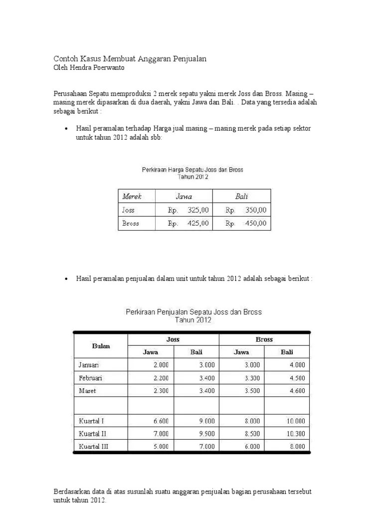 Contoh Perhitungan Anggaran Penjualan : Oleh Keti Purnamasari S E M Si Ppt Download / 5.2 menghitung biaya produksi lainnya.. Contoh kasus membuat anggaran penjualan oleh hendra poerwanto perusahaan sepatu memproduksi 2 merek sepatu yakni merek joss dan bross. Bagaimana cara penyusunan anggaran penjualan perusahaan? Standar kebutuhan bahan baku yang diperlukan adalah 10 gram/batang dan bahan herbal 20 gram/batang. Mengapa penyusunan anggaran penjualan lebih dari satu bulan? Mengapa anggaran penjualan harus dibuat pertama kali?